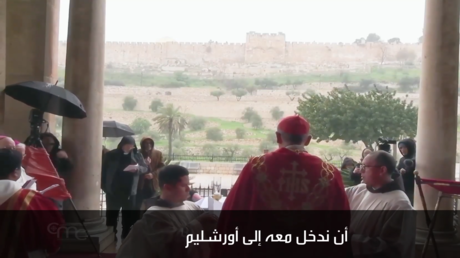 بعد منعه دخول كنيسة القيامة في أحد الشعانين.. بطريرك القدس للاتين يرأس صلاة من أجل السلام أمام القدس