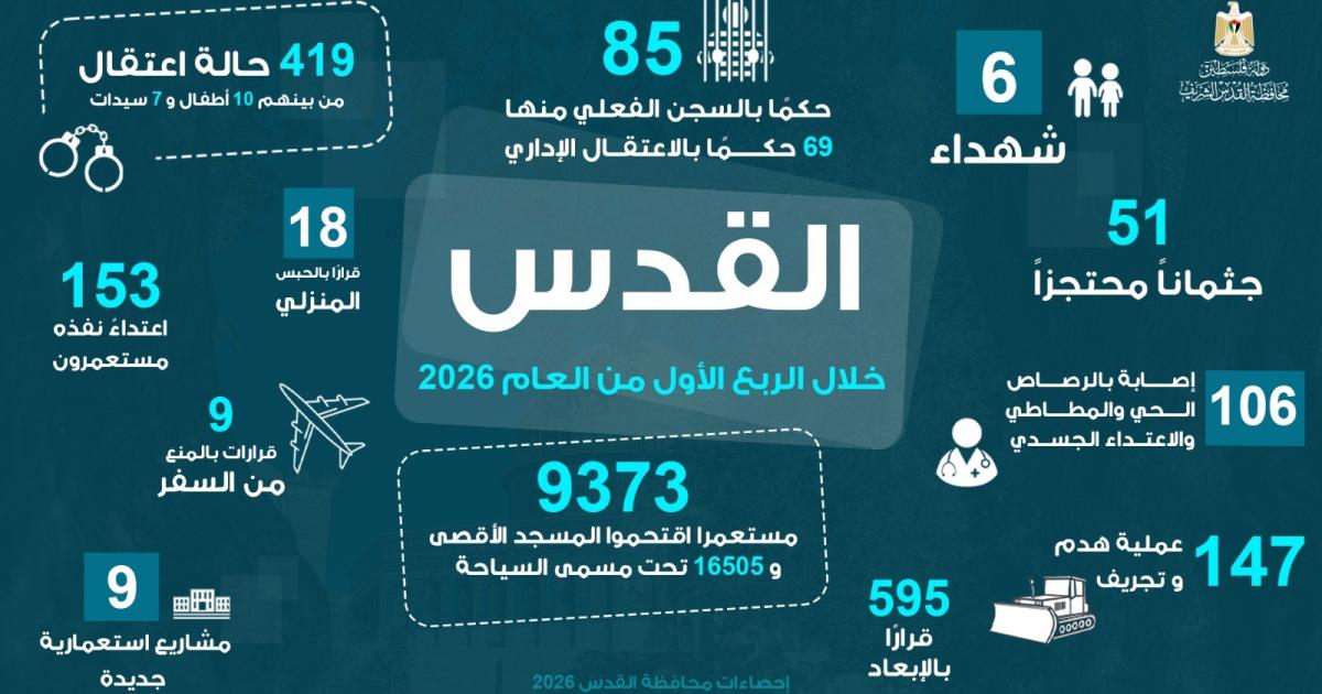 .st0{fill:#2C65A3;} nabd .img-responsive{max-width: 100%;height: auto;} الرئيسية القدس تفاصيل الخبر 6 شهداء و419 حالة اعتقال في القدس خلال الربع الأول من العام الجاري الخميس 02 ابريل 2026, 11:22 م محافظة القدس.jpg - 9373 مستعمرا اقتحموا الأقصى - 147 عملية هدم وتجريف و595 قرارا بالإبعاد قالت محافظة القدس، في تقرير لها، يوم الخميس 02 ابريل/نيسان 2026 ، إنها وثقت خلال الربع الأول من العام الجاري، استشهاد 6 مواطنين، و419 حالة اعتقال، واقتحام 9373 مستعمرا للمسجد الأقصى المبارك، الذي تغلقه سلطات الاحتلال الإسرائيلي منذ 28 شباط/ فبراير الماضي. رصدت محافظة القدس في تقريرها، استشهاد 6 مواطنين من المحافظة، في ظل تصاعد العدوان المنظم الذي تمارسه قوات الاحتلال الإسرائيلي والمستعمرون، وسط بيئة ممنهجة من الإفلات من العقاب وانعدام المساءلة. وقالت المحافظة إنها وثقت استشهاد كل من: نصر الله محمد جمال أبو صيام من مخماس إثر هجوم مسلح نفذه مستعمرون على بلدة مخماس في 18 شباط/ فبراير الماضي، ومراد شويكي أثناء عمله سائقا لحافلة داخل أراضي عام 48 في 18 آذار/ مارس، وقاسم أمجد أبو العمل شقيرات (21 عاما) بعد اقتحام قوات خاصة منزل عائلته في جبل المكبر في 25 آذار. كما وثقت استشهاد محمد فرج المالحي (38 عاما) من بلدة شرفات، إثر هجوم مسلح للمستعمرين في 26 آذار/ مارس، ومصطفى أسعد مصطفى حمد، وسفيان أحمد صالح أبو ليل في 27 آذار/ مارس، بعد استهدافهما برصاص قوات الاحتلال خلال اقتحام مخيم قلنديا. رصدت محافظة القدس خلال الربع الأول من العام الجاري، 106 إصابات بين المقدسيين، نتيجة اعتداءات متواصلة نفذتها قوات الاحتلال والمستعمرون، تنوعت بين الرصاص الحي والمعدني، والضرب، والغاز المسيل للدموع. وتركزت الإصابات بشكل لافت في محيط جدار الفصل العنصري، خاصة في بلدات: الرام، وكفر عقب، وسلوان، وعناتا، وبدو، والعيزرية، ومخيمي شعفاط وقلنديا، إلى جانب التجمعات البدوية في مخماس والخان الأحمر. كما أظهرت المعطيات تصاعدا في اعتداءات المستعمرين خلال شهري شباط وآذار، مع تسجيل إصابات جماعية، أبرزها في مخماس وخلة السدرة، ما يعكس استهدافا مباشرا للتجمعات الفلسطينية ومحاولات دفعها نحو التهجير القسري. وثقت محافظة القدس (419) حالة اعتقال لمواطنين، بينهم (10) أطفال و(7) سيدات، في إطار سياسة قمع ممنهجة شملت اقتحام المنازل والتوقيف على الحواجز والطرقات باستخدام القوة والتخويف. وتوزعت الاعتقالات في عدة مناطق أبرزها: مخيم قلنديا، والعيسوية، وعناتا، وسلوان، وكفر عقب، إضافة إلى محيط المسجد الأقصى، حيث طالت نشطاء وصحفيين وأسرى محررين وعددا كبيرا من العمال القادمين من محافظات الوطن، ما يعكس مساعي الاحتلال لفرض السيطرة على مختلف مناحي الحياة في القدس. قالت المحافظة، إنها رصدت خلال الربع الأول، تنفيذ (153) اعتداء للمستعمرين منها (32) إيذاء جسديا في مختلف أنحاء القدس، في سياق تصعيد منظم استهدف المسجد الأقصى والتجمعات البدوية والممتلكات والمقدسات الإسلامية والمسيحية، وأسفر عن استشهاد ثلاثة مقدسيين هم: نصر الله أبو صيام، ومراد شويكي، ومحمد المالحي. وتنوعت الاعتداءات بين إطلاق النار، والإيذاء الجسدي، وإحراق الممتلكات، والاستيلاء على منازل، وإقامة بؤر استعمارية، وإغلاق طرق، إلى جانب اعتداءات على الكنائس، ومحاولات إدخال قرابين إلى الأقصى والتحريض على طقوس تلمودية داخله. وجرت هذه الانتهاكات تحت حماية مباشرة من قوات الاحتلال، ما يعكس تكامل الأدوار في فرض وقائع جديدة على الأرض، فيما تتحمل سلطات الاحتلال المسؤولية الكاملة قانونيا عن هذه الجرائم في ظل غياب المساءلة واستمرار الإفلات من العقاب. عمليات الهدم والتجريف والاستيلاء على الممتلكات: رصدت محافظة القدس خلال الربع الأول من العام الجاري، (147) عملية هدم وتجريف، توزعت بواقع (23) عملية هدم ذاتي قسري أُجبر فيها المواطنون المقدسيون على هدم منازلهم بأيديهم، و(113) عملية هدم نفذتها آليات الاحتلال، إضافة إلى (11) عمليات تجريف استهدفت أراضي وممتلكات 