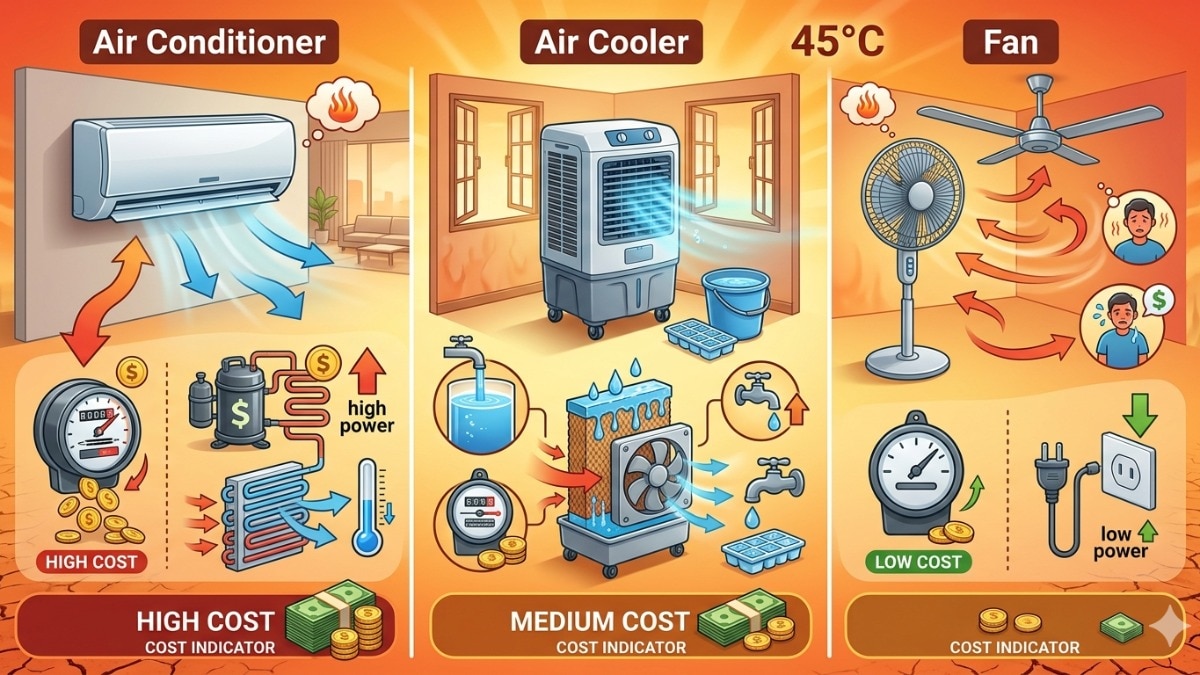 AC vs Cooler vs Fan: What's cheapest to run in 45°C heat? Full cost breakdown