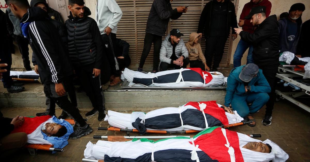 أقارب الضحايا يلقون نظرة أخيرة على جثامين فلسطينيين سقطوا في غارة جوية إسرائيلية شرق مخيم المغازي