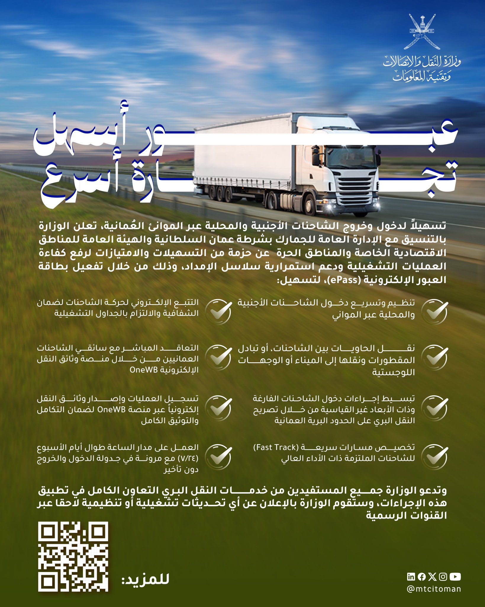 الصحوة – تعلن الوزارة عن إطلاق حزمة من التسهيلات والامتيازات التشغيلية لتنظيم حركة الشاحنات الأجنبية والمحلية وتيسير انسيابية التجارة عبر موانئ سلطنة عمان وذلك من خلال بطاقة العبور الإلكترونية (ePass)