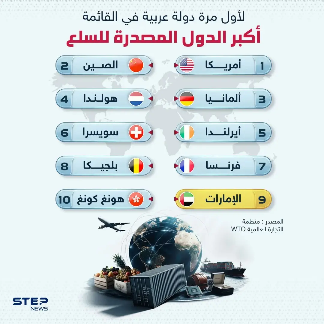 لأول مرة تدخل الإمارات العربية المتحدة قائمة أكبر عشر دول مصدّرة للسلع عالميًا وفق بيانات منظمة التجارة العالمية، لتتقدّم إلى المرتبة التاسعة