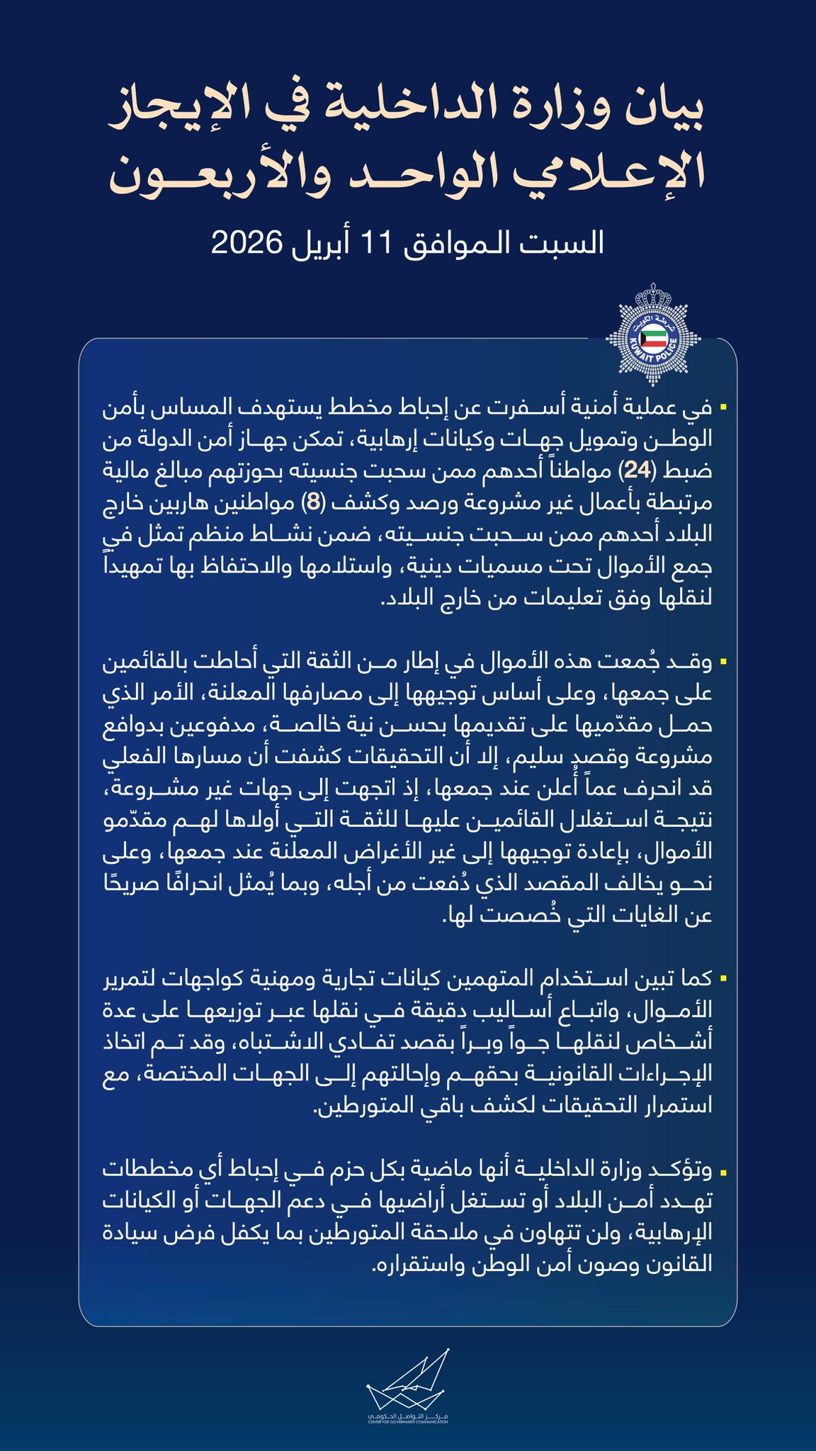 أعلنت وزارة الداخلية الكويتية، في بيانها ضمن الإيجاز الإعلامي الحادي والأربعين، إحباط مخطط" يستهدف المساس بأمن الوطن وتمويل جهات وكيانات إرهابية، مؤكدة ضبط 24 مواطنا أحدهم مسحوبة جنسيته، بحوزتهم مبالغ مالية مرتبطة بأنشطة غير مشروعة".