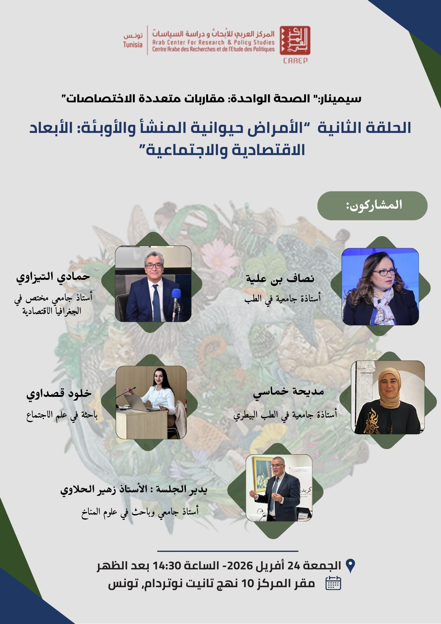 ينظم، المركز العربي للأبحاث ودراسة السياسات بتونس، الحلقة الثانية من سلسلة الندوات العلمية الصحة الواحدة مقاربات متعددة الاختصاصات والتي جاءت تحت عنوان الأمراض حيوانية المنشأ والأوبئة: الأبعاد الاقتصادية والاجتماعية، وذلك يوم الجمعة 24 أفريل 2026.