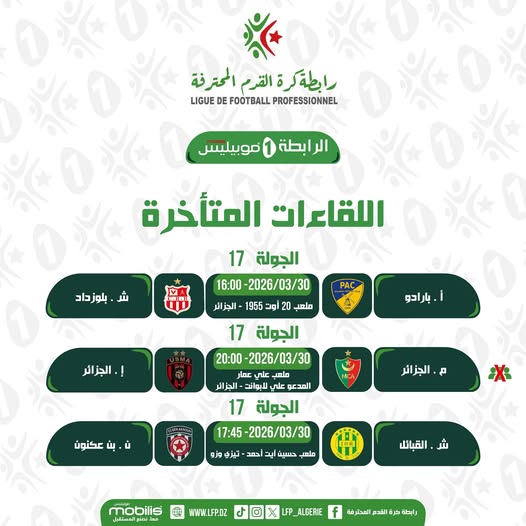 أعلنت الرابطة المحترفة لكرة القدم، اليوم الاثنين، عن برنامج تسوية المباريات المتأخرة للجولة الـ17 من البطولة، والتي ستُلعب يوم 30 مارس الجاري، وسط ترقب كبير لمواجهات قوية ومؤثرة في سباق الترتيب.