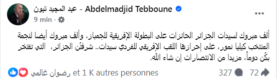 وجّه رئيس الجمهورية، عبد المجيد تبون، تهنئة خاصة لسيدات المنتخب الوطني الجزائري للجمباز، عقب تتويجهن بلقب البطولة الإفريقية، مشيدًا بالأداء المشرف الذي قدمنه طيلة المنافسة.