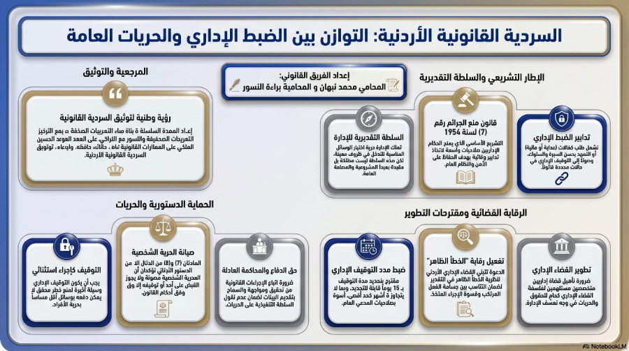 السلسلة القانونية (191): التوقيف الإداري على ضوء قانون منع الجرائم الأردني (فيديو) (video) مدار الساعة ـ نشر في 2026/04/21 الساعة 17:28 حجم الخط خاص – مدار الساعة الإخباريإعداد وتقديم:المحامي محمد نبهان، والمحامية براءة النسور.بالتعاون مع موقع مدار الساعة الإخباريمشرف التحرير: عواد الخلايلة---يأتي هذا الفيديو انسجامًا مع ما أكّد عليه سمو ولي العهد الأمير الحسين بن عبدالله الثاني بشأن توثيق السردية القانونية الأردنية، وتعزيز التوازن بين حفظ الأمن العام وضمان الحقوق والحريات في المملكة الأردنية الهاشمية.ويتناول الفيديو التوقيف الإداري على ضوء قانون منع الجرائم الأردني من منظور قانوني مبسّط، موضحًا مفهوم التوقيف الإداري باعتباره إجراءً وقائيًا يُتخذ من قبل الحاكم الإداري بهدف منع وقوع الجرائم أو الحد من خطورة أشخاص يُخشى منهم على الأمن والنظام العام.كما يستعرض المحتوى الأحكام التي نظمها قانون منع الجرائم الأردني، والتي تمنح الحاكم الإداري صلاحيات اتخاذ تدابير مثل التوقيف أو فرض كفالة أو تعهد، ضمن شروط وضوابط محددة تهدف إلى تحقيق الأمن دون تجاوز حدود القانون.ويتطرق الفيديو كذلك إلى الإشكاليات القانونية التي يثيرها هذا الإجراء، لا سيما من حيث مدى توافقه مع ضمانات الحرية الشخصية، وحق التقاضي، ومبدأ عدم التوقيف إلا بقرار قضائي، إضافة إلى دور القضاء في الرقابة على مشروعية قرارات التوقيف الإداري.ويهدف الفيديو إلى بيان أن التوقيف الإداري يمثل أداة استثنائية يجب استخدامها ضمن أضيق الحدود ووفق ضوابط قانونية دقيقة، في إطار محتوى توعوي يربط النصوص القانونية بالتطبيق العملي ويعزز ثقافة سيادة القانون واحترام الحقوق والحريات. مدار الساعة ـ نشر في 2026/04/21 الساعة 17:28 مدار الساعة أخبار الأردن مناسبات أردنيةولي العهدالحسين بن عبدالله الثانيالمملكة الأردنية الهاشميةالأمن العامسيادة القانون