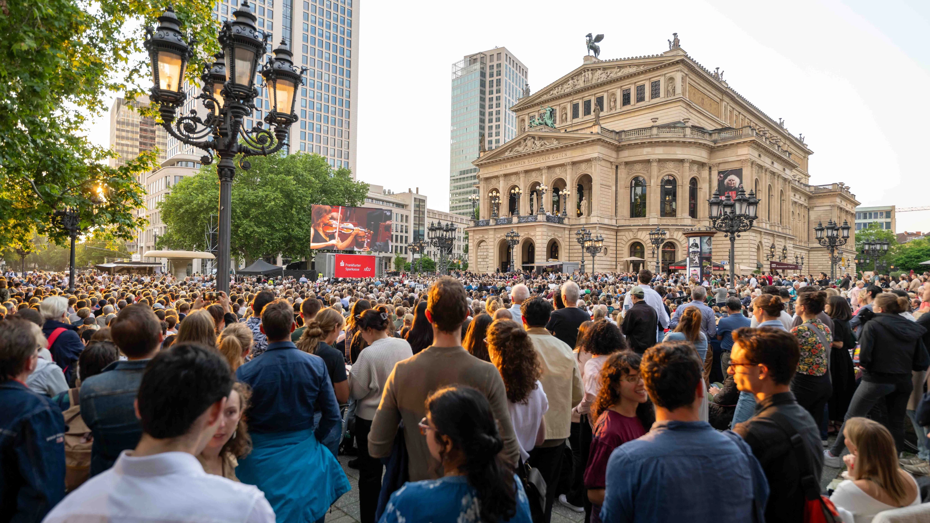 Alte Oper Frankfurt : Der verlängerte KonzertsaalVon Guido Holze26.04.2026, 14:28Lesezeit: 4 Min.Bildbeschreibung ausklappenPublic Viewing: Beim „Orchesterfest“ verfolgen immer Hunderte auf dem Opernplatz live eine Konzertübertragung aus der Alten Oper, wie hier 2025.Wonge BergmannZwischen Bubbles und Brücken: Die Alte Oper Frankfurt setzt auf überraschende Allianzen, so kommen Musik und Friedensforschung zusammen.Zusammenfassung Anhören Merken TeilenVerschenkenDrucken Zur App Jeder, der im Internet auf Social-Media-Kanälen oder über Suchmaschinen jemals besonderes Interesse an etwas gezeigt hat, kennt das: Sofort bekommt man die nächsten Angebote zum Thema, seien es Produkte, Urlaubsangebote oder Nachrichten. Gut finden das vermutlich zwar nur wenige, entziehen kann sich dem aber niemand. „Wir sind in unseren Bubbles“, sagt auch Markus Fein. Als Intendant und Geschäftsführer der Alten Oper versucht er dem mit einem breiten Programmangebot entgegenzutreten. Dazu geht er gerne Kooperationen mit anderen Kultureinrichtungen ein, um auf diese Weise Blicke über den Tellerrand zu ermöglichen.Ein sehr erfolgreiches Beispiel dafür hat jüngst das Festival mit Wim Wenders in der Alten Oper gegeben. Unter dem Titel „Driven by Music“ gab der Filmemacher mit einem von ihm persönlich kuratierten und moderierten Programm Einblicke in seine intensiv von Musik inspirierte filmische Arbeit. Gleichzeitig und abgestimmt eröffnete dazu das Deutsche Filminstitut und Filmmuseum in Frankfurt die Wenders-Ausstellung „W.I.M. Im Lauf der Zeit“, die noch bis 18. Oktober zu sehen ist.„Dieses Miteinander der Kulturinstitutionen zeichnet Frankfurt aus“, sagt Fein. Und der sehr gute Publikumszuspruch im aktuellen Fall zeige abermals, dass der genreübergreifende Ansatz im Konzerthaus ankommt. Wenders habe sich so in Frankfurt sehr wohlgefühlt und sich begeistert gezeigt, „wie aufgeschlossen das Publikum ist“, berichtet Fein.Musik in guter VerbindungDie künstlerische Arbeit an Filmen, wie sie Wender...