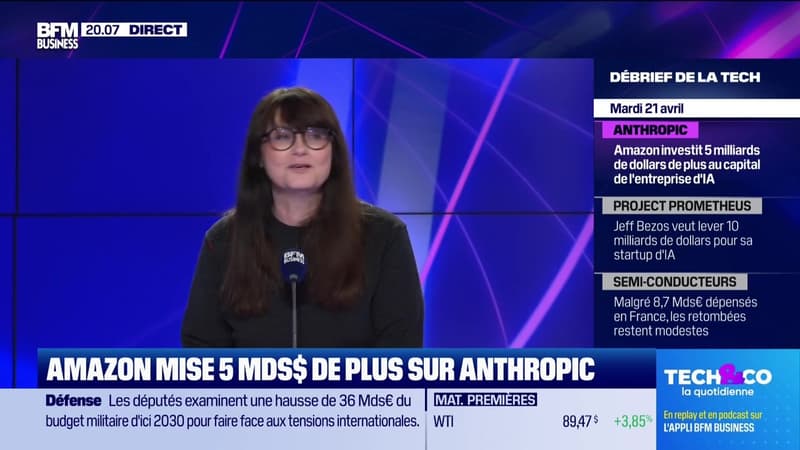 Ce mardi 21 avril, Frédéric Simottel a reçu Michel Levy Provençal, fondateur de TEDxParis et de l'agence Brightness, Cédric Ingrand, directeur général de Heavyweight Studio, et Fanny Bouton, directrice du quantique chez OVHCloud. Ils se sont penchés sur l'investissement supplémentaire de cinq milliards d’Amazon sur Anthropic, les dix milliards recherchés par Jeff Bezos pour sa start-up IA, et les 8,7 milliards dépensés par la France pour les puces en sept ans, dans l'émission Tech & Co, la quotidienne, sur BFM Business. Retrouvez l'émission du lundi au jeudi et réécoutez-la en podcast.