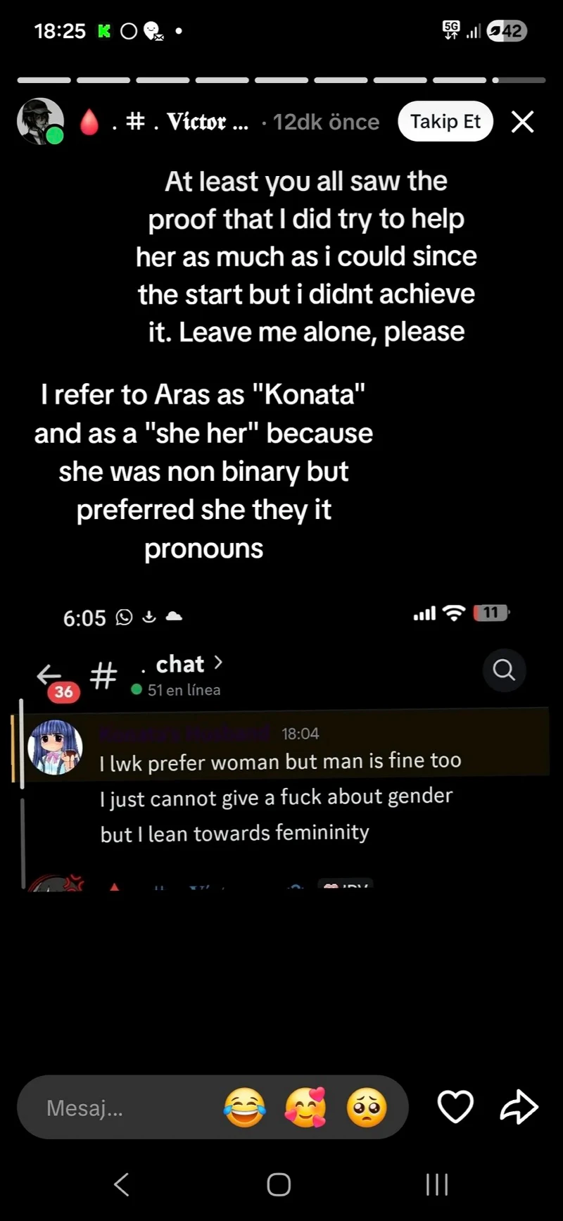 Aras'ın kendisine 'Konata' takma adını seçtiğini belirten; kendisi de 'Victor' rumuzunu kullanan Arjantinli, "En azından hepiniz, baştan beri ona elimden geldiğince yardım etmeye çalıştığımın kanıtını gördünüz ama başaramadım. Lütfen beni yalnız bırakın. 'Aras'tan 'Konata' olarak bahsediyorum ve "she/her" (o/kız) zamirlerini kullanıyorum çünkü non-binary idi ama "she/they/it" zamirlerini tercih ediyordu." ifadelerini kullandı.