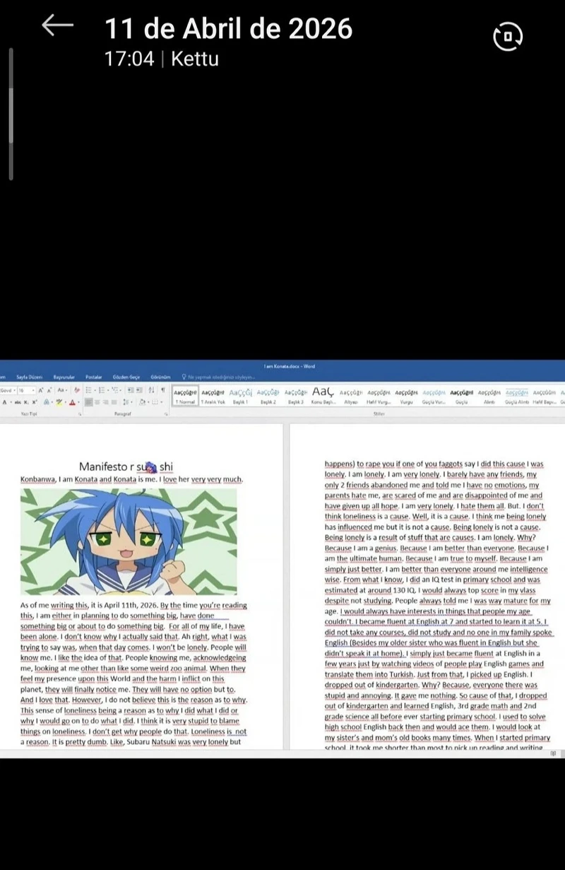 Katilin 11 Nisan'da yazdığı not da ortaya çıktı. “Manifesto ya da bir şey” sözleriyle başlayan İngilizce yazıda, “Konbanwa, ben Kontaa ve Konata’yım. Onu çok ama çok seviyorum. Bunu yazarken tarih 11 Nisan 2026. Sen bunu okuduğunda ya bir şey planlıyor olacağım, yapmış olacağım ya da yapmak üzere olacağım. Hayatım boyunca hep yalnız kaldım. Nedenini bilmiyorum, aslında çok fazla şeyim vardı. Hep insanlarla kaynaşmaya çalıştım ama yalnız kaldım. İnsanların beni tanıması, fark etmesi hoşuma gidiyor. Bu dünyadaki varlığımı ve verdiğim zararı hissetsinler istiyorum ki sonunda beni fark etsinler. Bunun nasıl olacağını bilmiyorum ama yapacağım. Ancak yalnızlık yaptığım şeyin sebebi değil. Yapmak istesem de yalnızlık yüzünden suçlayamam. İnsanlar bunu yapıyor ama bu doğru değil. Yalnızlık bir sebep değildir.” ifadeleri yer alıyor.