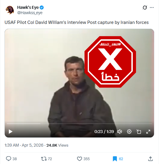 وجاء تداول الفيديو بالمزاعم الخاطئة في وقت أعلن الرئيس الأميركي دونالد ترامب في وقت مبكر أمس الأحد استعادة الطيار الثاني الذي كان مفقودا منذ تحطم طائرته الحربية في إيران الجمعة، في ما قال إنها "واحدة من أجرأ عمليات البحث والإنقاذ في تاريخ الولايات المتحدة"، على ما أوردت وكالة "فرانس برس".