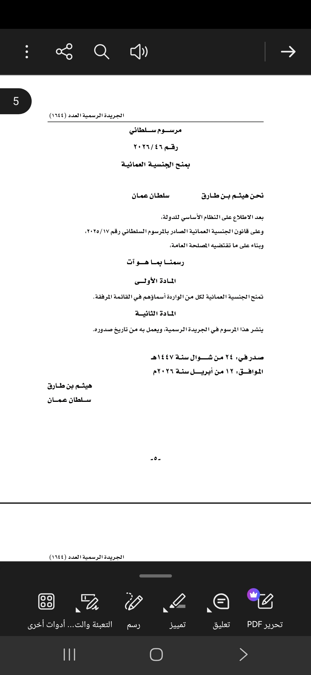 بالأسماء.. مرسوم سلطاني بمنح الجنسية العمانية لـ226 شخصا