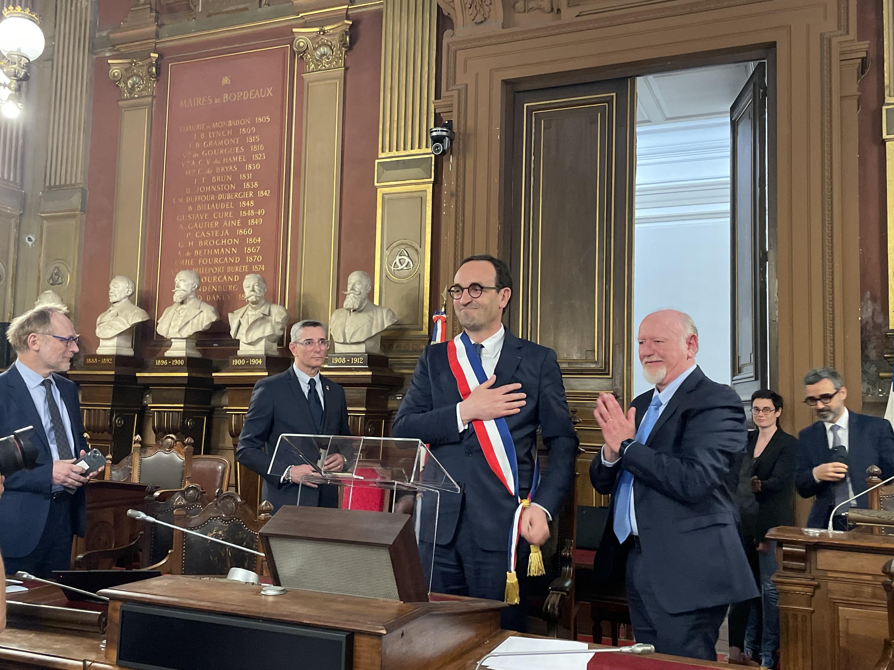 Le macroniste Thomas Cazenave a fait ce vendredi ses premiers pas au Palais Rohan et présidé son premier conseil municipal. Dans la matinée, le maire écologiste sortant Pierre Hurmic a salué chaleureusement ses équipes à l’heure de son départ.