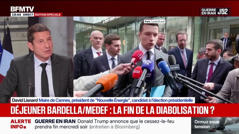 BFM-Politique"Ça ne me choque pas du tout": David Lisnard réagit au déjeuner entre Jordan Bardella et le MedefInvité de BFMTV, David Lisnard, maire de Cannes, a réagit à la rencontre entre les patrons du Medef et le président du RN.Aujourd'hui à 19h48 | Durée : 0:39PartagerX