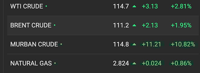 Brent — the global benchmark — was above $111, while UAE Murban crude climbed above $114.8, marking strong demand for barrels that can be moved outside chokepoints like the Strait of Hormuz.