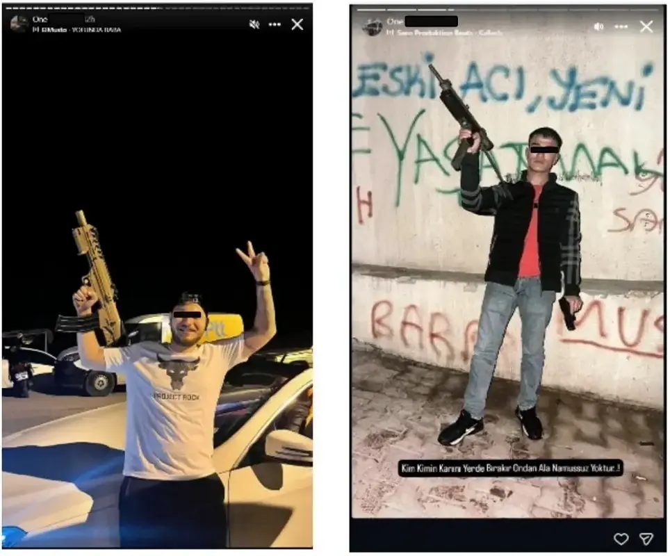 Söz konusu paylaşımlarda şüphelilerin, motosiklet üzerinde maskeli ve silahlı pozlar verdikleri, "sadece ölüler görür" gibi tehditkar ifadelerle suç faaliyetlerini sergiledikleri görüldü.
