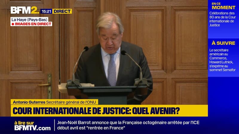 Le chef de l'ONU Antonio Guterres prononce un discours à la Cour internationale de justice (CIJ), à l'occasion du 80e anniversaire de la plus haute instance juridique de l'ONU à La Haye, vendredi 17 avril.