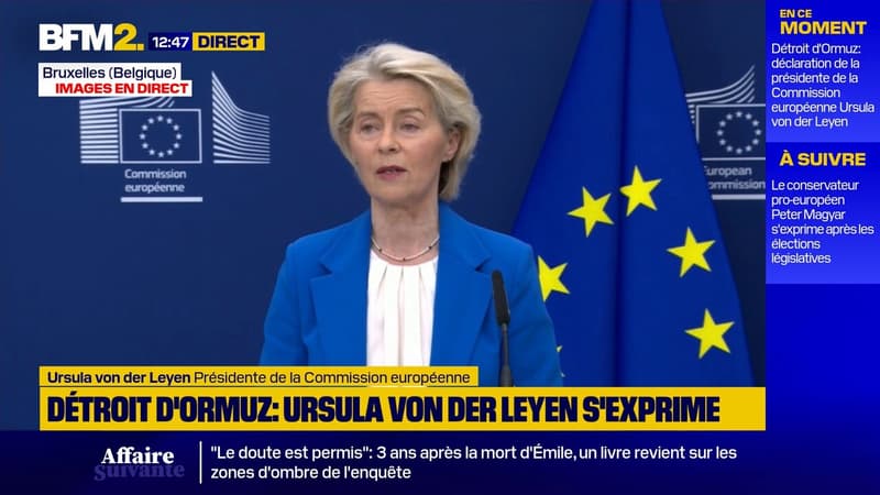 BFM-International-EuropeDétroit d'Ormuz: "Nous payons cher notre surdépendance aux importations d'énergies fossiles", déplore Ursula von der LeyenLa présidente de la Commission européenne, Ursula von der Leyen, prend la parole ce lundi 13 avril, depuis Bruxelles, et revient sur la guerre au Moyen-Orient.Aujourd'hui à 14h28 | Durée : 1:30PartagerX