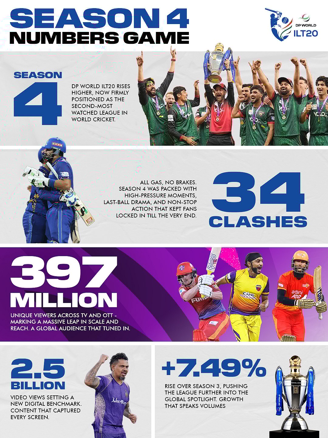 Season 4 of the DP World ILT20 T20 showcased top T20 talent, with Sam Curran (Desert Vipers) named Player of the Tournament and Best Batter, Waqar Salamkheil (MI Emirates) taking Best Bowler honours, and Muhammad Waseem awarded Best UAE Player.