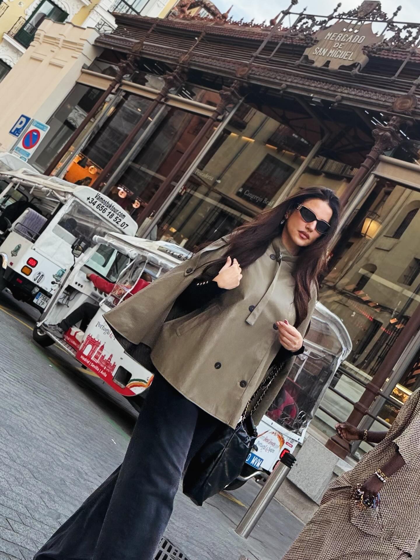 في إحدى جولاتها السياحية في مدريد، ارتدت درّة زرّوق سترة بنمط "كاب" قصير من الجلد بلون البيج مع أزرار كبيرة بلون بُنيّ-رماديّ (ZW Collection Faux Leather Cape Jacket) من "زارا" (Zara) وقدّمتها بأسلوب يعكس هدوءاً بصرياً وأناقة غير متكلّفة، حيث نسّقتها مع كنزة ناعمة سوداء اللون وسروال واسع من الدنيم الدخاني اللون من "لويفي" (Loewe). كذلك، وضعت نظّارة شمسيّة سوداء من "شانيل" (Chanel)، وحملت حقيبة كتف سوداء من العلامة نفسها، وانتعلت جزمة من الجلد الأسود.