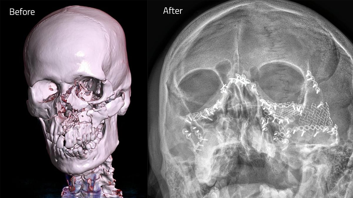 For this patient, who did not wish to be identified, the damage was extensive: multiple fractures of the jaw, cheekbones, nasal bones and eye sockets, significant loss of nasal cartilage and teeth, disrupted jaw alignment, and orbital injuries that placed his vision at serious risk.