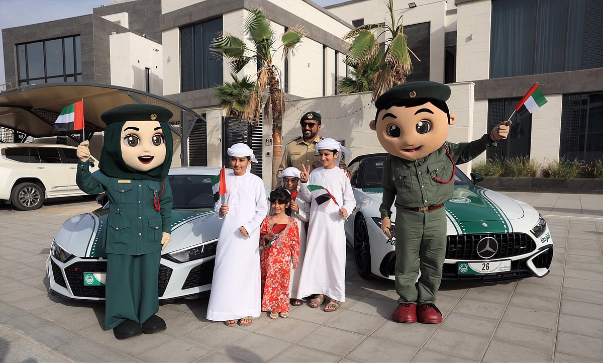 Led by the General Department of Community Happiness, the campaign saw residential areas transformed into festive settings. Dubai Police teams distributed UAE flags to residents and engaged with families in an atmosphere of celebration. The presence of luxury patrol vehicles, mounted units and officers added to the spectacle, while the popular mascots Mansour and Amna brought a lively, family-friendly touch.