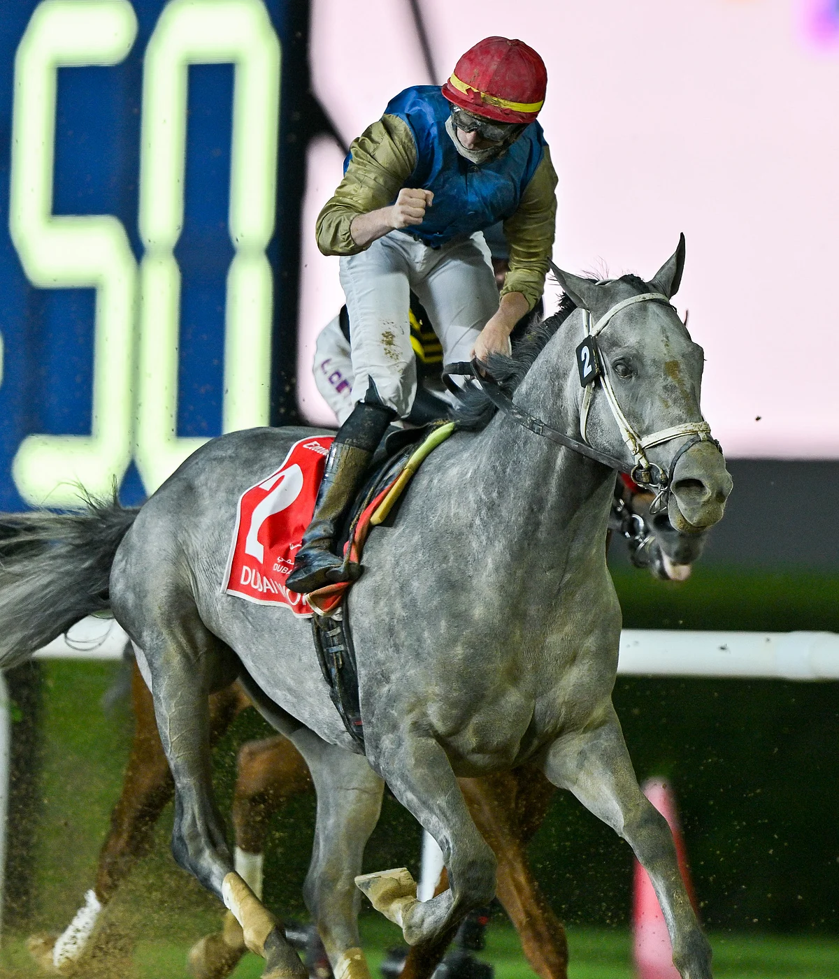 HIT SHOW ridden by Florent Geroux, winner of the DUBAI WORLD CUP at the Dubai World Cup 2025, held at Meydan Racecourse on Saturday, April 5, 2025