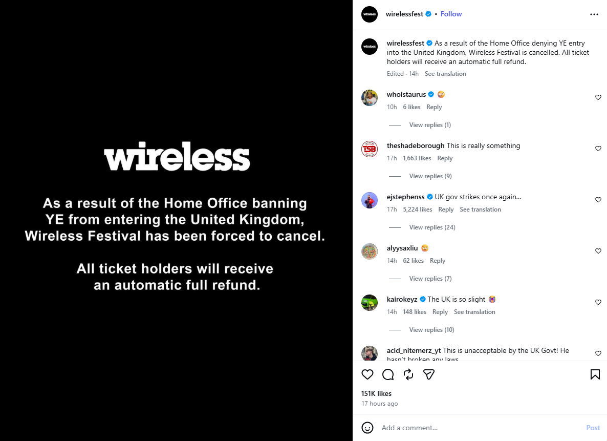 وأشاد ديفيد شويمر، بالجهات الراعية التي انسحبت من "مهرجان وايرلس" في المملكة المتحدة بعد الإعلان عن مشاركة الفنان كانييه ويست (Ye)، كأحد أبرز نجوم المهرجان في حزيران (يونيو) الماضي. (وقد ألغى المنظمون المهرجان بالكامل لاحقاً بسبب منع ويست من دخول المملكة المتحدة).