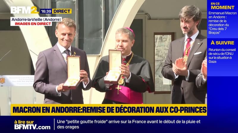 BFM-InternationalEmmanuel Macron décoré de la Croix des Sept bras de la Principauté d'AndorreEmmanuel Macron, en qualité de co-prince d'Andorre, reçoit la Croix des Sept bras (Creu dels 7 Braços), la plus haute décoration de la Principauté, ce mardi 28 avril.Aujourd'hui à 17h03 | Durée : 0:46PartagerX