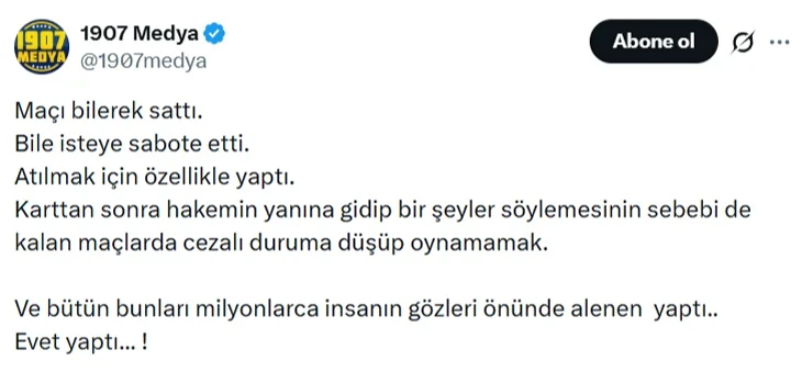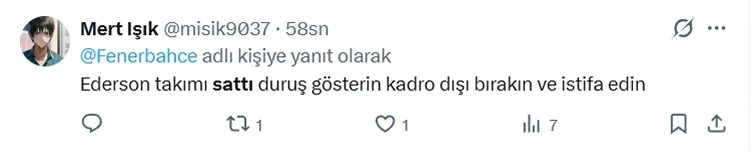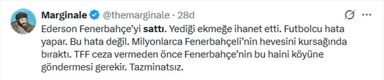 Karşılaşmanın ardından sarı-lacivertli taraftarlar sosyal medyada Ederson’a tepki gösterdi. Bazı taraftarlar, tecrübeli kalecinin gördüğü kırmızı kartın takımını zor durumda bıraktığını savunarak “takımı sabote etti” yönünde eleştirilerde bulundu.