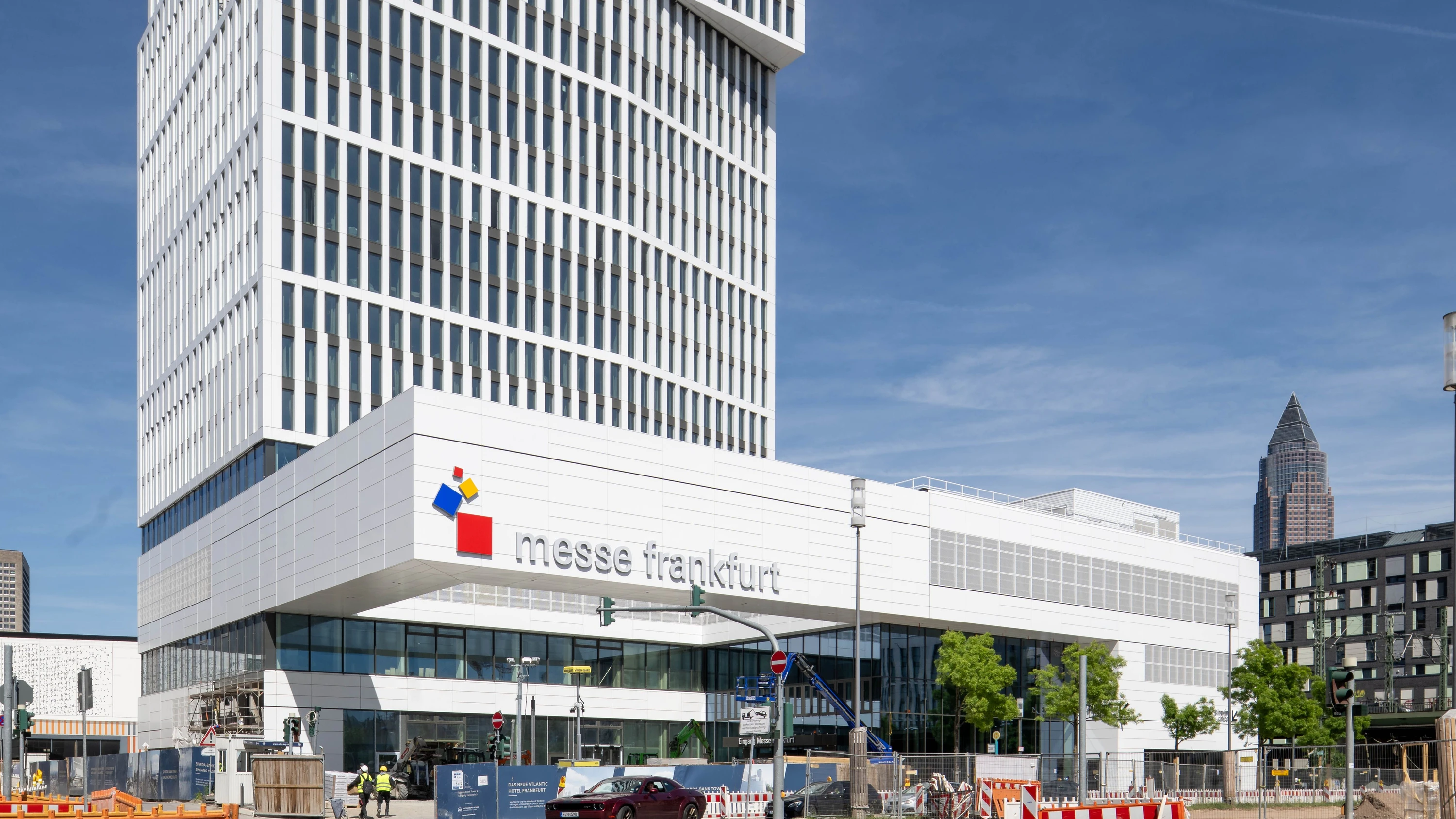 Frankfurt : Neuer Messeeingang fast fertigVon Patricia Andreae28.04.2026, 14:21Lesezeit: 3 Min.Bildbeschreibung ausklappenStrahlkraft: Der neue Eingang zur Europa-Allee soll den Zugang zum Gelände verbessern.Wonge BergmannDer neue Eingang der Messe Frankfurt an der Europa-Allee ist fast fertig. Er soll helfen, die Besucherströme besser zu bewältigen. Doch ein Baustein fehlt noch.Zusammenfassung Anhören Merken TeilenVerschenkenDrucken Zur App Quadrate in Rot, Gelb und Blau sowie der hellgraue Schriftzug Messe Frankfurt auf der weißen Metallverkleidung des Gebäudesockels machen seit einigen Tagen deutlich, dass der neue Eingang der Messe Frankfurt fast fertig ist. Das Gebäude schmiegt sich in L-Form um den Sockel des Sparda-Bank-Turms, der darüber 124 Meter hoch aufragt und demnächst auf 35 Meter Höhe ein Hotel sowie Büros beherbergen soll.Noch wird an der Pflasterung des Vorplatzes gearbeitet, doch im Inneren des Gebäudes sieht es fast schon so aus, als könnten die Türen jederzeit geöffnet werden. Nur ein wenig Baustaub muss noch von den blauen Wänden und Polstern der Möbel des Gastronomiebereichs entfernt werden. Dann kann der Betrieb auch in dem öffentlichen Café losgehen. Damit will man sich bei der Messe allerdings noch ein wenig Zeit lassen. Die offizielle Eröffnung des neuen Eingangs „Europa-Allee“ ist, wie Olaf Kühl, Bereichsleiter Facility Management der Messe, sagt, erst für September geplant. Dann, wenn Tausende Besucher auf die Messe Automechanika strömen.Bessere Erreichbarkeit des westlichen GeländesFür die Messe ist das 5000 Quadratmeter umfassende Gebäude, wie der frühere Geschäftsführer Uwe Behm bei der Grundsteinlegung 2022 es nannte, „der Schlussstein“ der Modernisierung des Geländes. Über die Rolltreppen im Inneren des Portalkomplexes gelangen die Messebesucher nach der Eingangskontrolle zur „Via Mobile“. Es ist das 120 Meter lange, jüngste Stück des insgesamt 1,7 Kilometer langen Systems von verglasten Gängen mit Laufbändern, das alle Hallen...