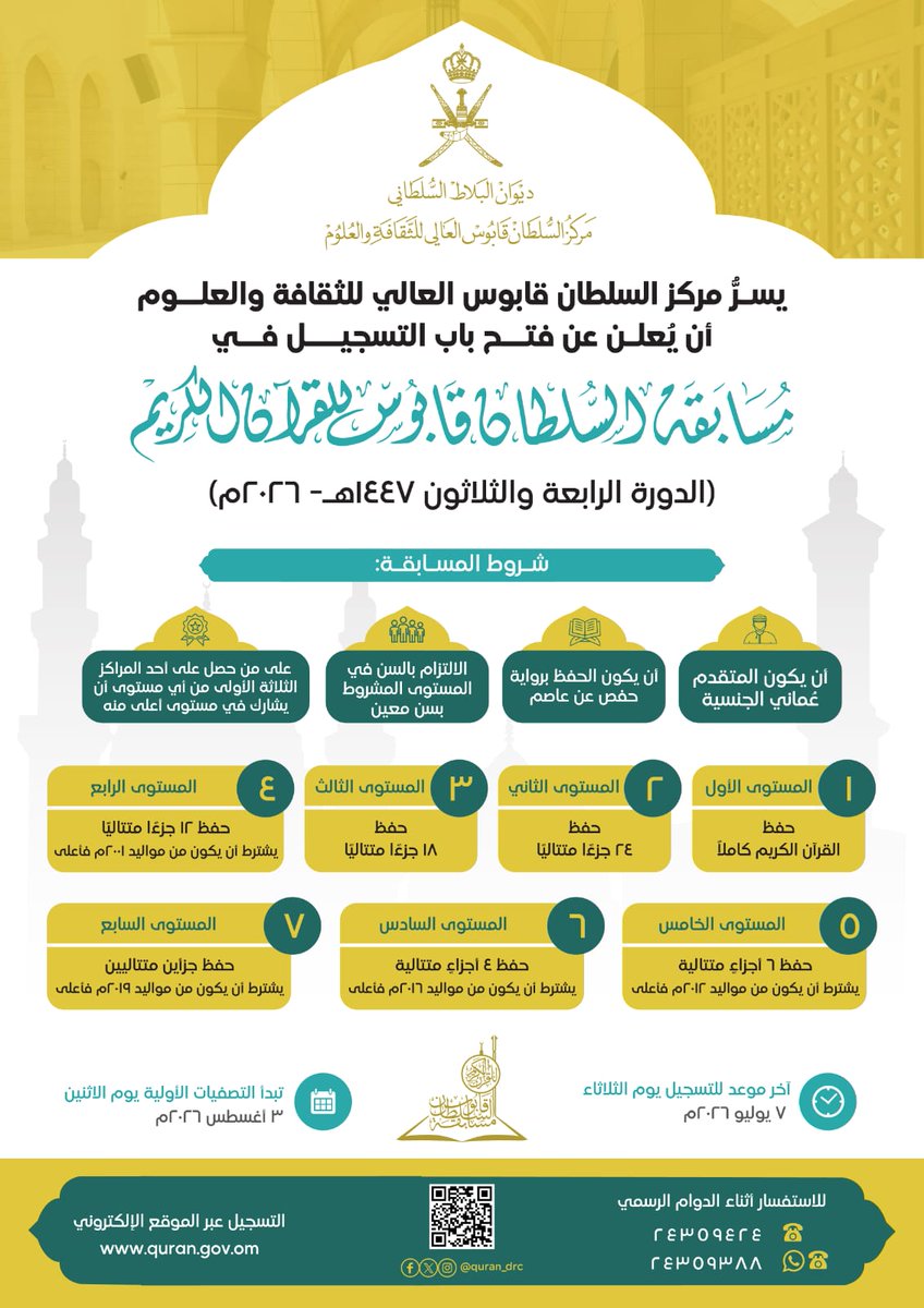 الصحوة – أعلن مركز السلطان قابوس العالي للثقافة والعلوم عن فتح باب التسجيل في مسابقة السلطان قابوس للقرآن الكريم في دورتها الرابعة والثلاثين، داعيًا الراغبين في المشاركة إلى الاطلاع على الشروط والتسجيل عبر الموقع الإلكتروني المخصص للمسابقة.