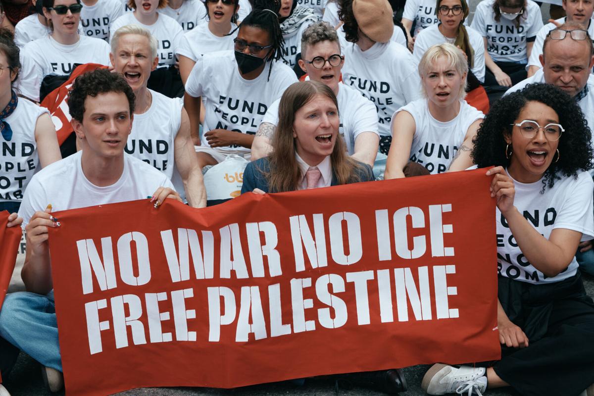 ودعت منظمة "جويش فويس فور بيس" إلى التظاهرة التي ضمت نحو 200 متظاهر أغلقوا شارعاً رئيسياً في مانهاتن لمدة تقارب الساعة احتجاجاً على الدعم العسكري الأميركي لإسرائيل.