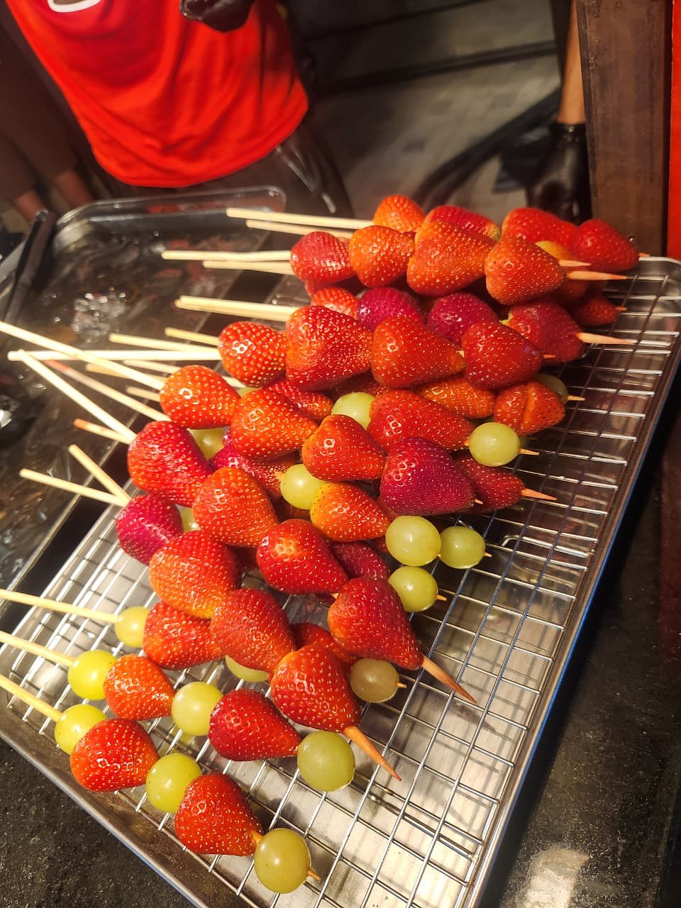 Glossy strawberries and grapes coated in crunchy sugar, an Instagram favourite that tastes as good as it looks.
