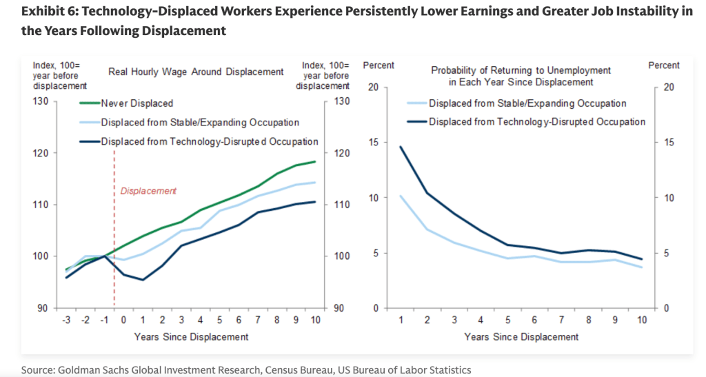 In a research note published Monday, Goldman Sachs economists Pierfrancesco Mei and Jessica Rindels drew on four decades of individual-level data to assess what they call the “scarring” effects of technological displacement on U.S. workers. Their verdict is sobering. Workers whose jobs are eliminated by technology don’t just struggle in the short term—they can spend the better part of a decade fighting to recover.