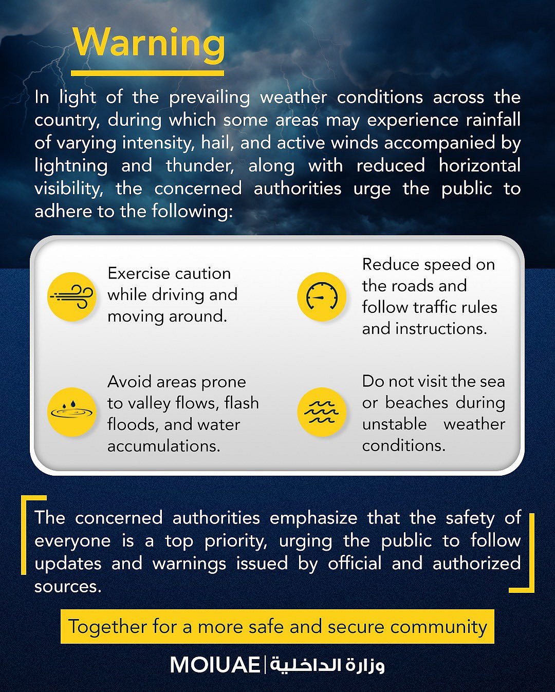Emergency and field teams across the UAE have been deployed to monitor water accumulation, maintain traffic flow, and respond quickly to incidents. Residents have been urged to: