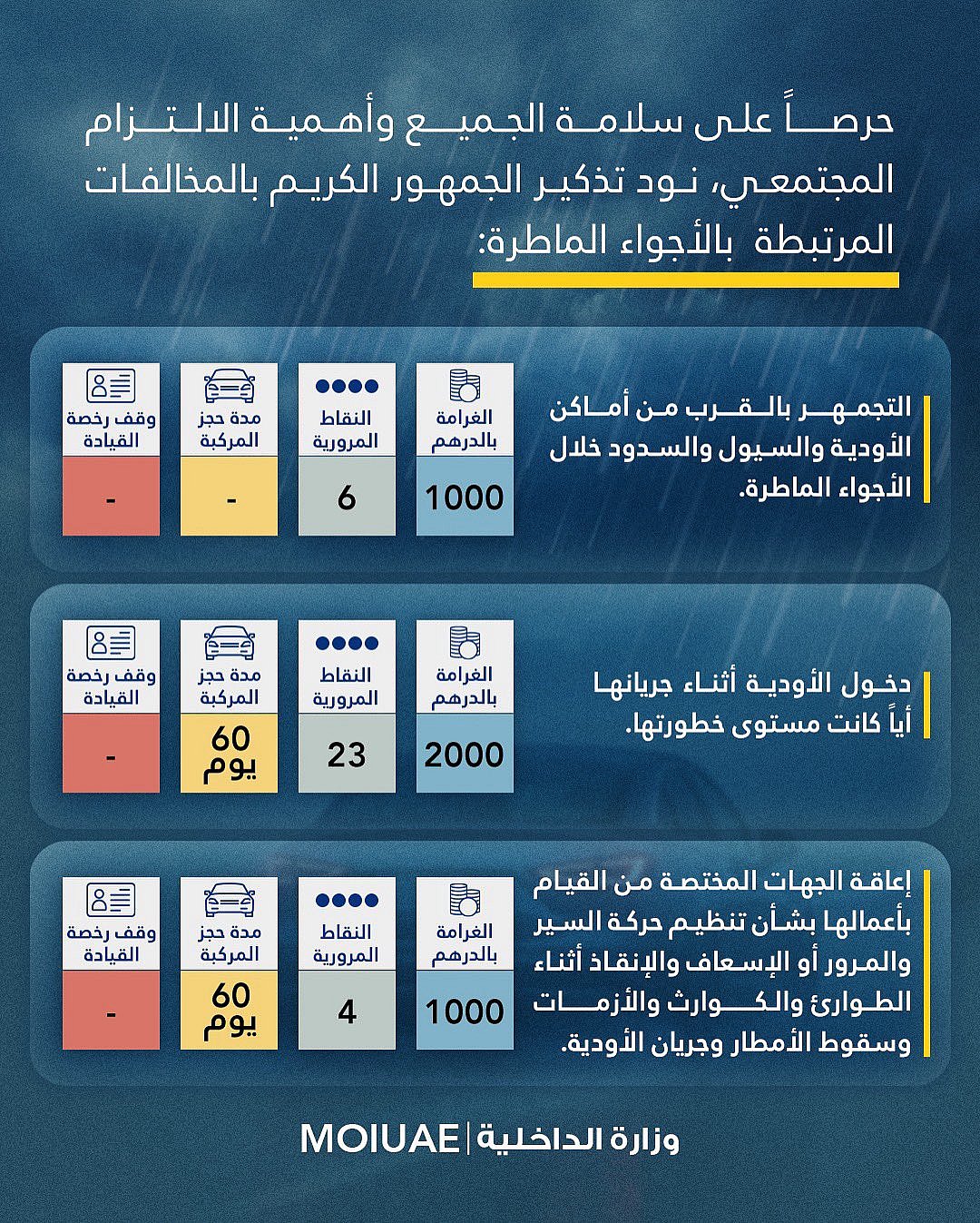 Gathering near valleys, flood channels, or dams during rainfall carries a Dh1,000 fine and six traffic points.