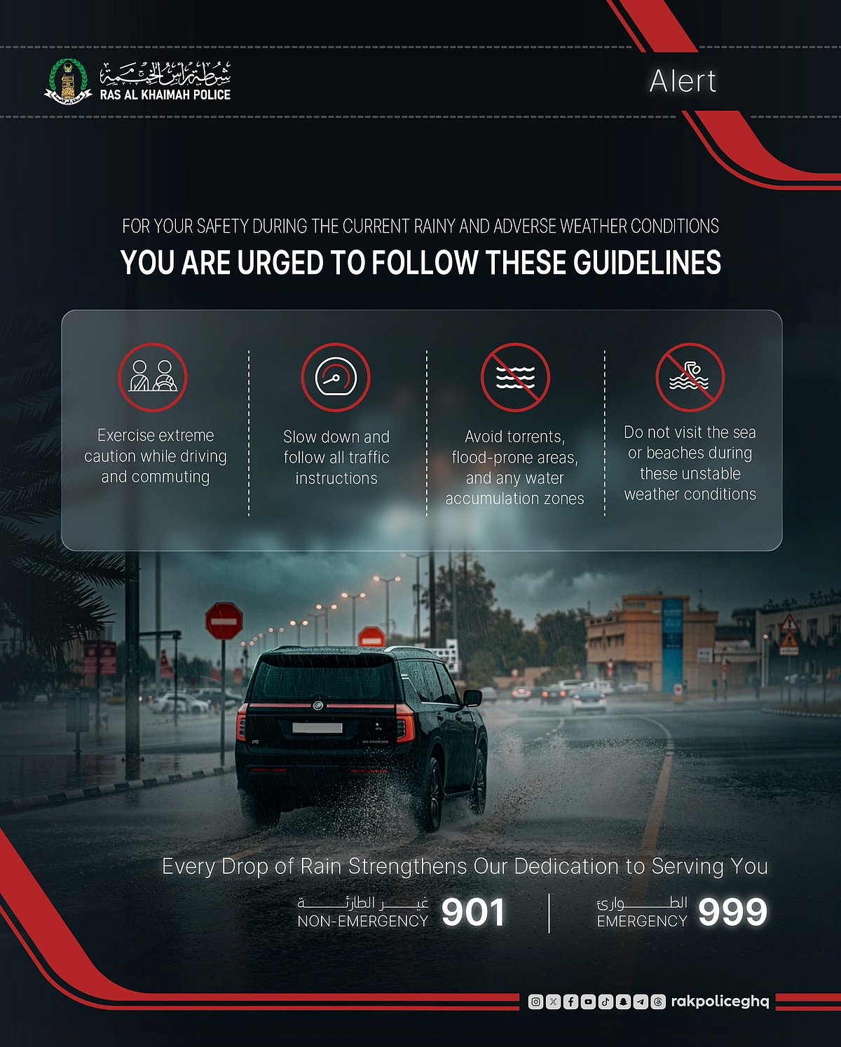 The Ras Al Khaimah Police have issued a safety alert as the emirate experiences rainy and adverse weather conditions. Residents and motorists are urged to exercise caution and follow the safety guidelines: