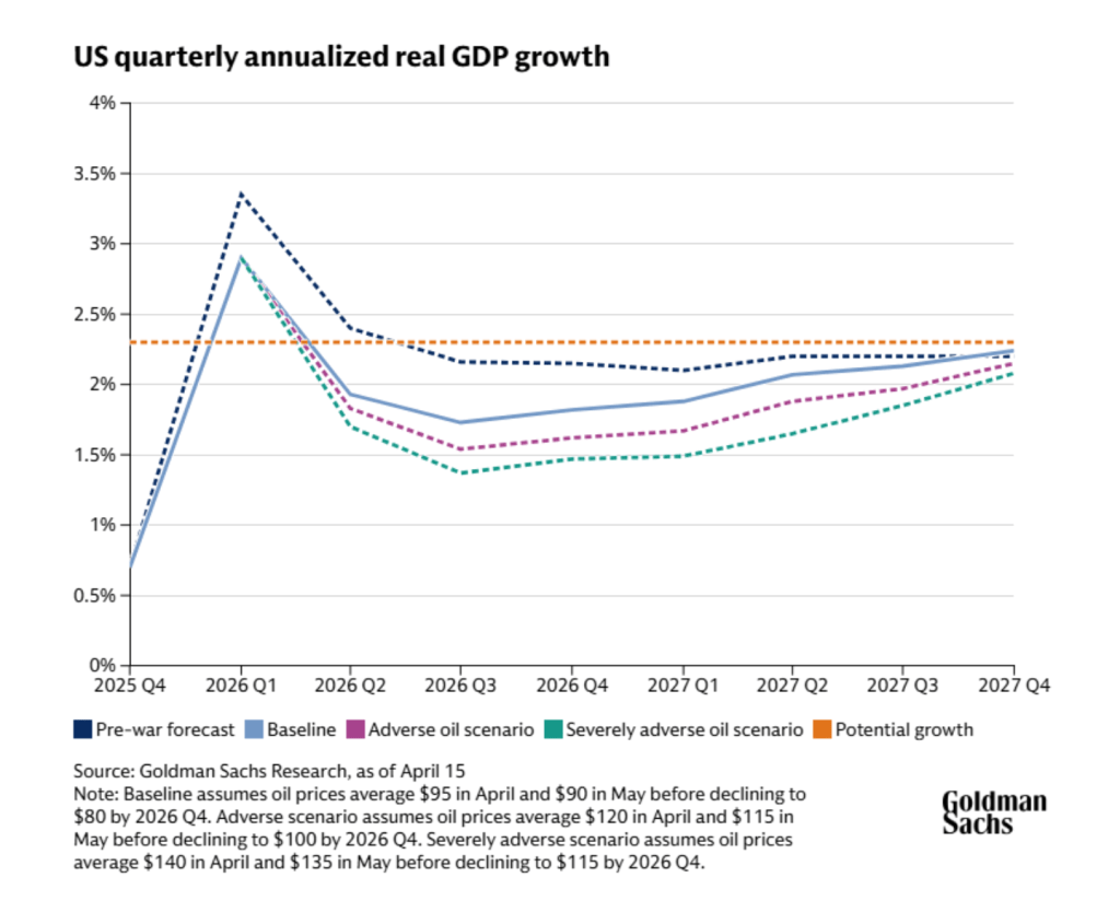The stock market recovery is the headline. The rates market, Goldman warns, is telling a more sobering story: bond traders are pricing in hawkish central banks bracing for an inflation surge. Goldman’s economists have already raised their December 2026 headline PCE inflation forecast by a full percentage point to 3.1%, and trimmed their 2026 GDP growth forecast by half a point to 2%—a direct consequence of higher oil prices erasing much of the expected boost from last year’s fiscal bill.