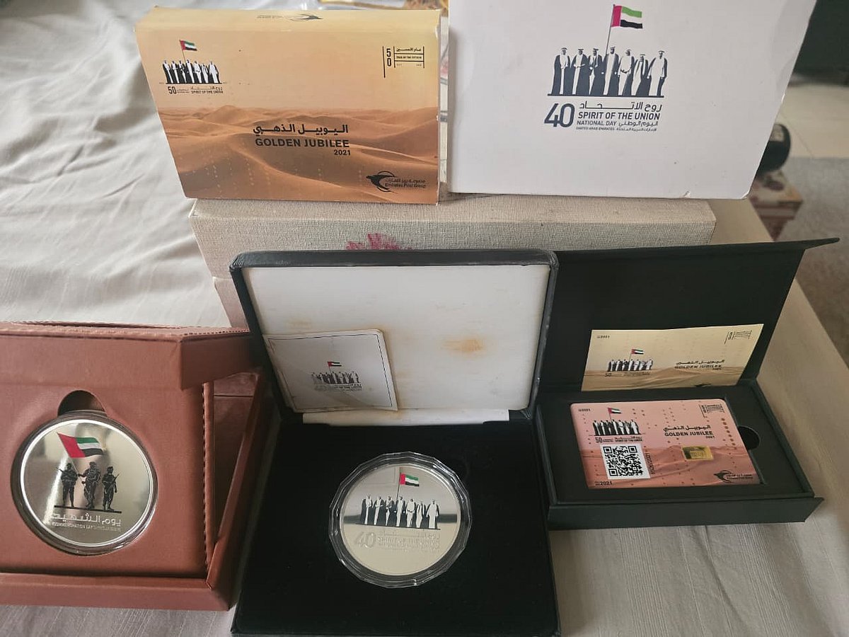 His collection also features rare numismatic and digital pieces. A silver commemorative coin issued on Commemoration Day bears the UAE flag, while a separate silver coin marks the 40th anniversary of the establishment of the UAE.