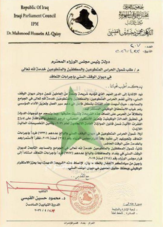 القيسي يطالب بشمول حراس الوقف السني المتطوعين والمكلفين بإجراءات التعاقد