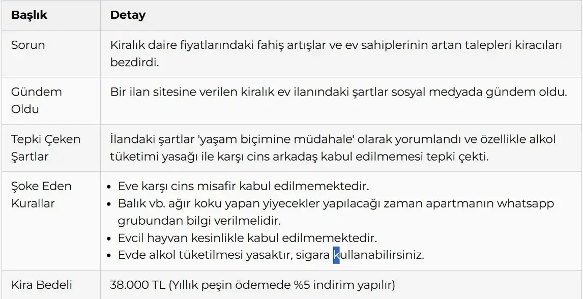 Kiralık daire fiyatlarındaki fahiş artışlar devam ederken, ev sahiplerinin de talepleri arttıkça arttı. Fiyatların yükselmesinin yanında bir de karşılanması zor olan talepler kiracıları adeta bezdirdi. Bir ilan sitesine verilen kiralık ev ilanında yer alan şartlar sosyal medyada gündem oldu.