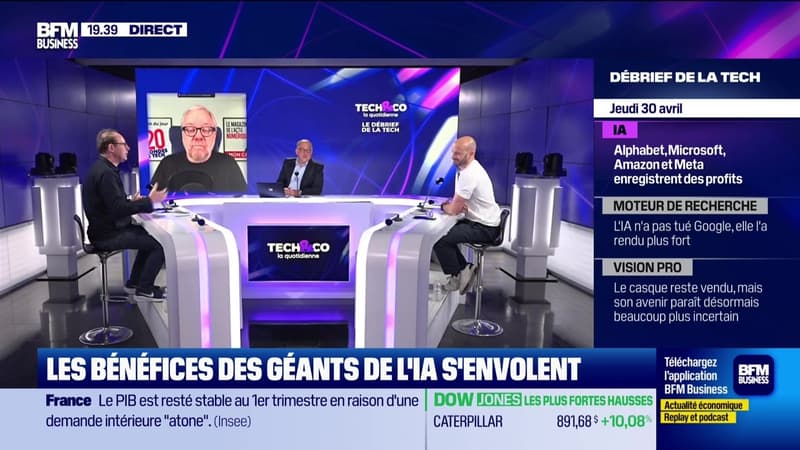 Ce jeudi 30 avril, François Sorel a reçu Clément David, président de Theodo Cloud, Enguérand Renault, directeur de la rédaction de Satellifacts, et Bruno Guglielminetti, journaliste et animateur de "Mon Carnet de l'actualité numérique". Ils se sont penchés sur la forte hausse des bénéfices des géants de l'IA, le carton de Google malgré l'arrivée de Chatgpt, et l'incertitude sur l'avenir du casque Vision Pro d'Apple, dans l'émission Tech & Co, la quotidienne, sur BFM Business. Retrouvez l'émission du lundi au jeudi et réécoutez la en podcast.