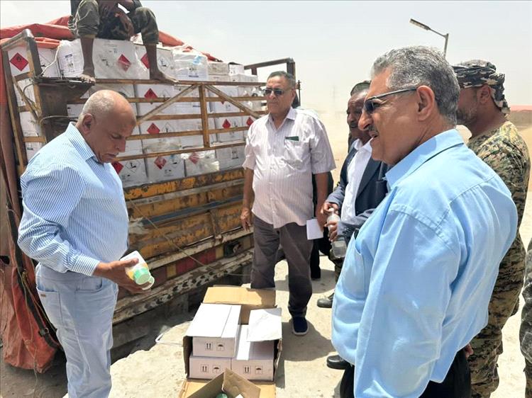لجنة من وزارة الزراعة والثروة السمكية تنزل لمعاينة شاحنة مبيدات حشرية مضبوطة في لحج