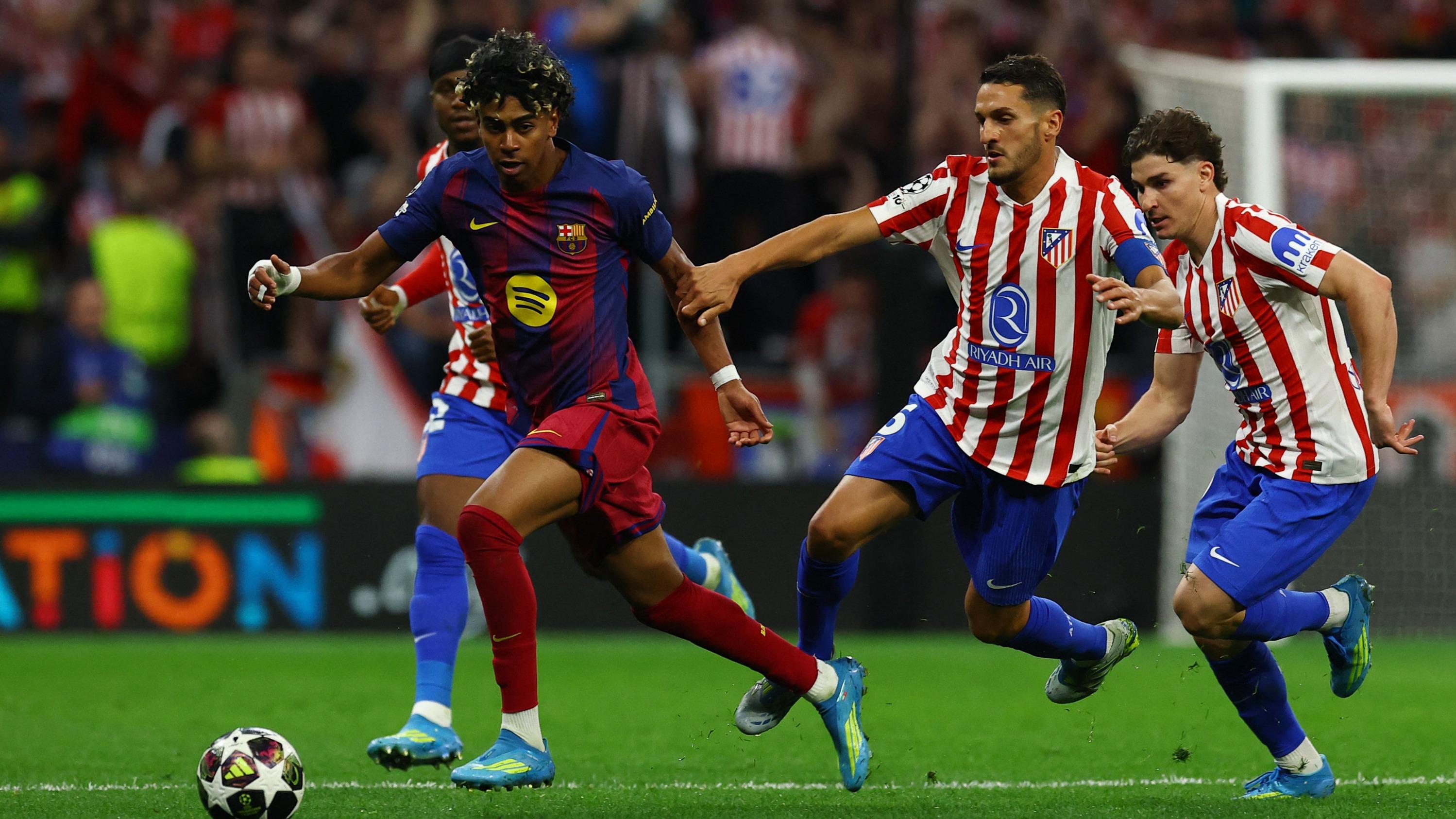 Ligue des champions : au terme d’un match grandiose, l’Atlético Madrid de Griezmann élimine le Barça Par Pablo Guillen Le 14 avril 2026 à 23h09 Suivre Sujets Lamine Yamal FC Barcelone Lire dans l’app Copier le lien Lien copié Mail Facebook X Linkedin Messenger WhatsApp Lamine Yamal. Albert Gea / REUTERS Ce mardi soir au Metropolitano, le FC Barcelone a vu son parcours s’arrêter en quart de finale de Ligue des champions, éliminé par l’Atlético Madrid (1-2, 3-2 score final). Passer la publicité Passer la publicité Publicité Plus d’informations à suivre... À découvrir Calendrier et résultats Ligue des champions Classement Ligue des champions
