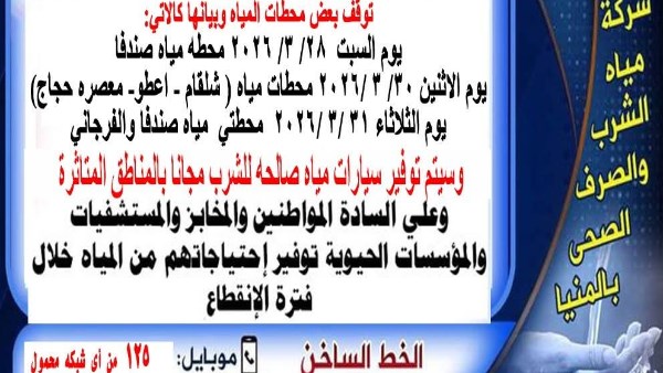 لمدة 3 أيام.. انقطاع مياه الشرب عن بعض قرى مركز بني مزار في المنيا