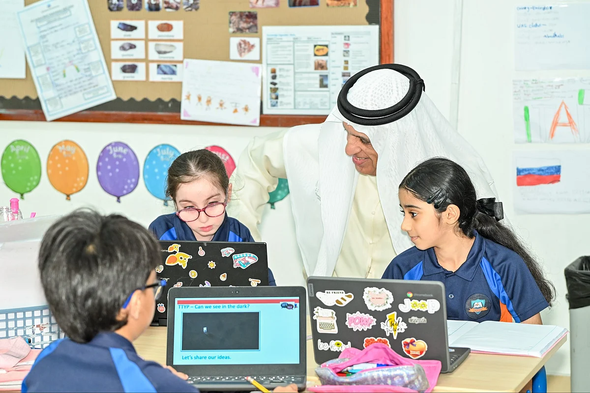 The Ras Al Khaimah ruler sat down with students, looked at their classwork and even watched them play games at the school