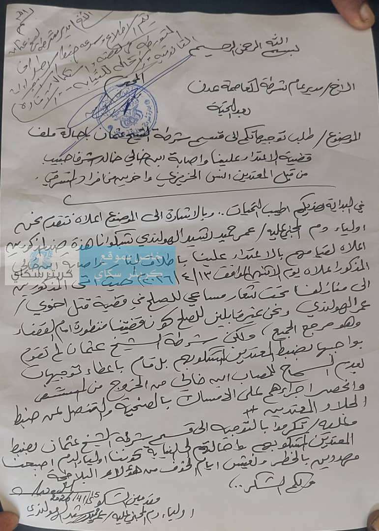 افادت مصادر لكريتر سكاي بصدور توجيهات من مدير امن عدن اللواء مطهر الشعيبي بضبط المتهمين بحادثة اطلاق النار على الشاب خالد اشرف واصابته بقدمه واجراء له عملية وتركيب حديد.بحسب التوجيه لشرطة الشيخ عثمان...