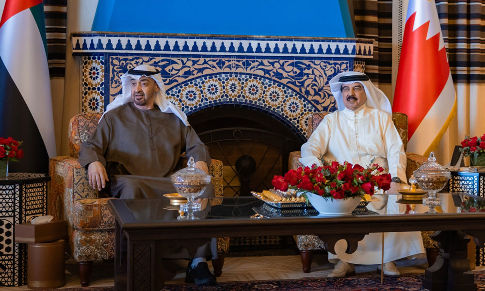 وقالت وكالة الأنباء البحرينية (بنا) إن العاهل البحريني أكد خلال اجتماعه بالرئيس الإماراتي أن الإمارات سطرت عبر مختلف المراحل حضورها كشريك أصيل لا يساوم على وحدة الصف ولا يتردد في الوقوف إلى جانب أشقائه مشيدا بالمواقف الثابتة لرئيس دولة الإمارات العربية المتحدة التي تعكس وضوح الرؤية ورسوخ النهج.